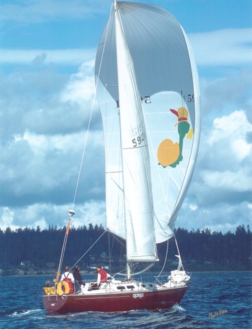 Moored in freshwater at the Seattle Yacht Club since new, Escargot is distinctive with her burgundy-colored hull. Designed to the IOR rule with a large foretriangle, and a big, skeg-hung rudder, she is well-behaved under sail.